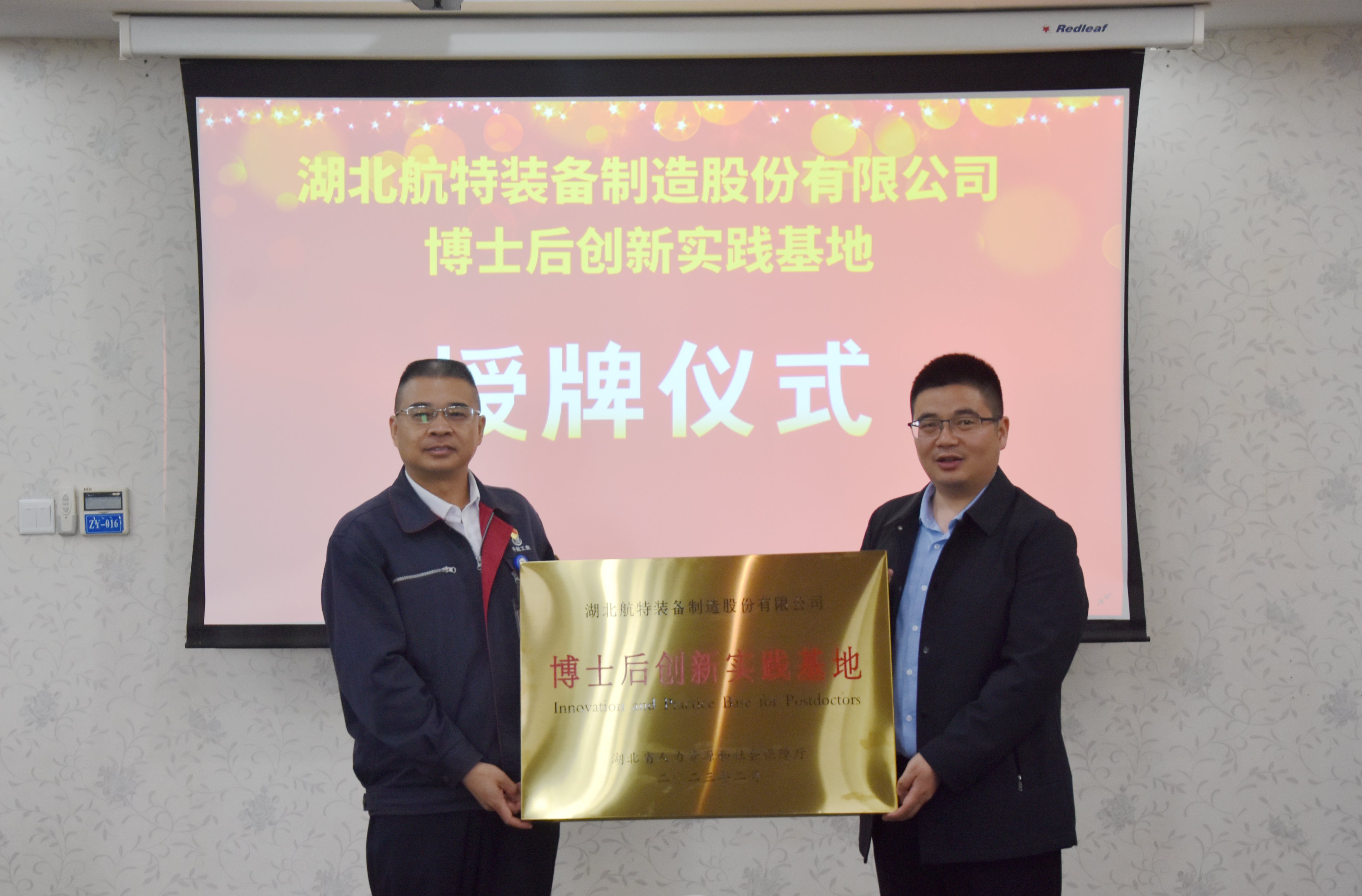 4月28日,航特裝備博士后創(chuàng)新實踐基地授牌儀式舉行。荊門市人力資源和社會保障局黨組成員、副局長譚凌華為航特裝備授牌,副總經(jīng)理陳海軍代表公司接牌。